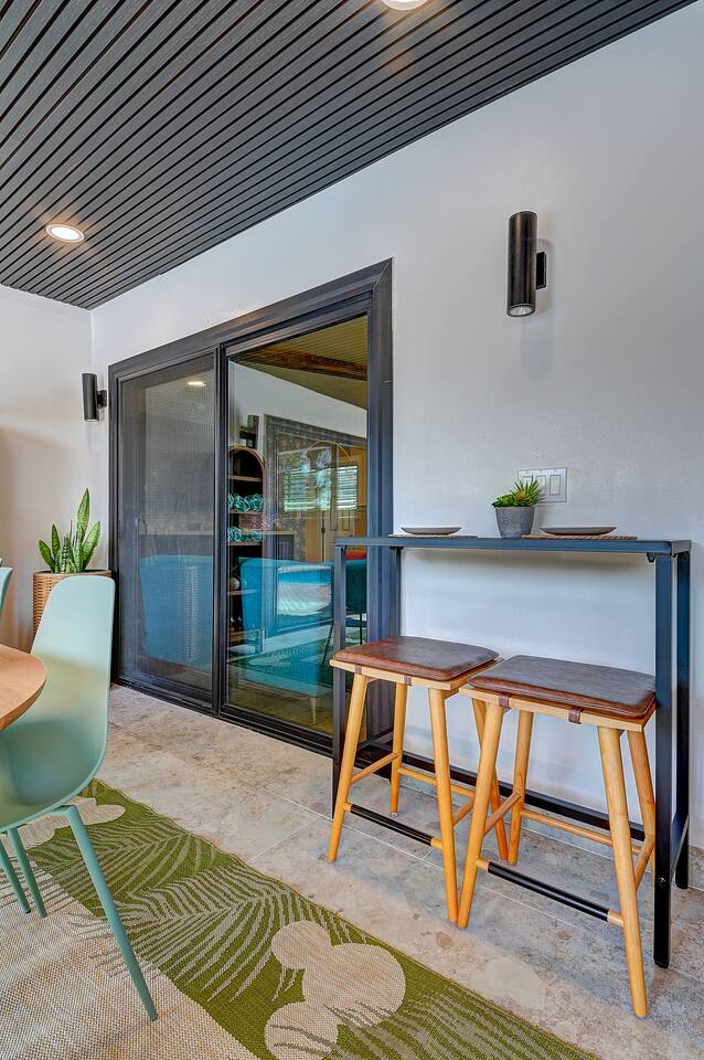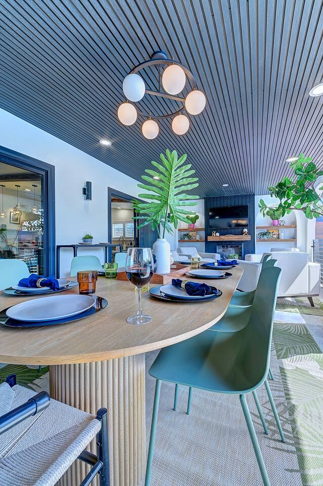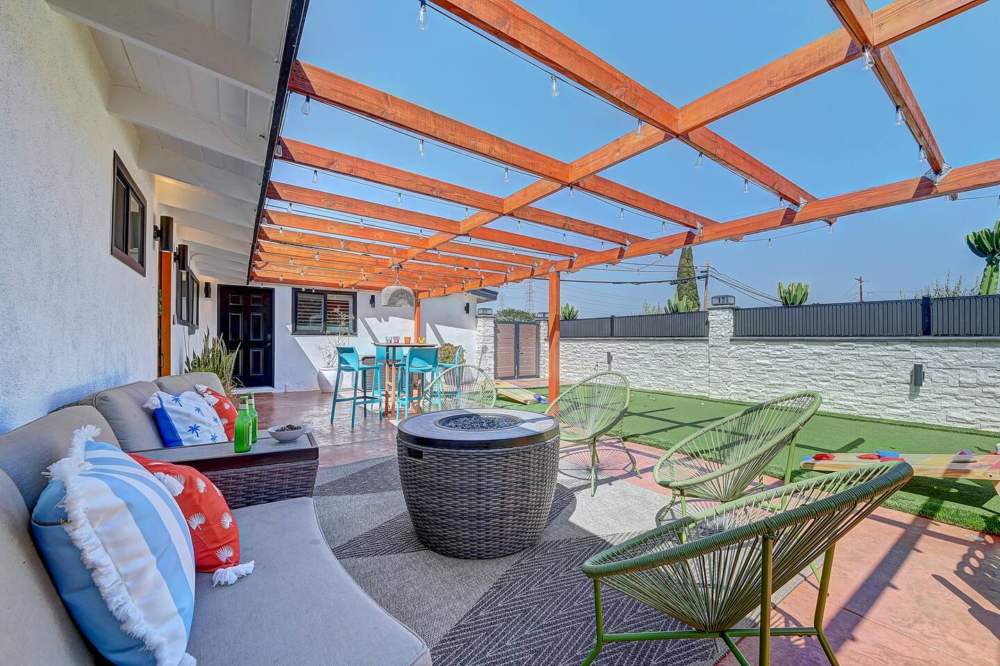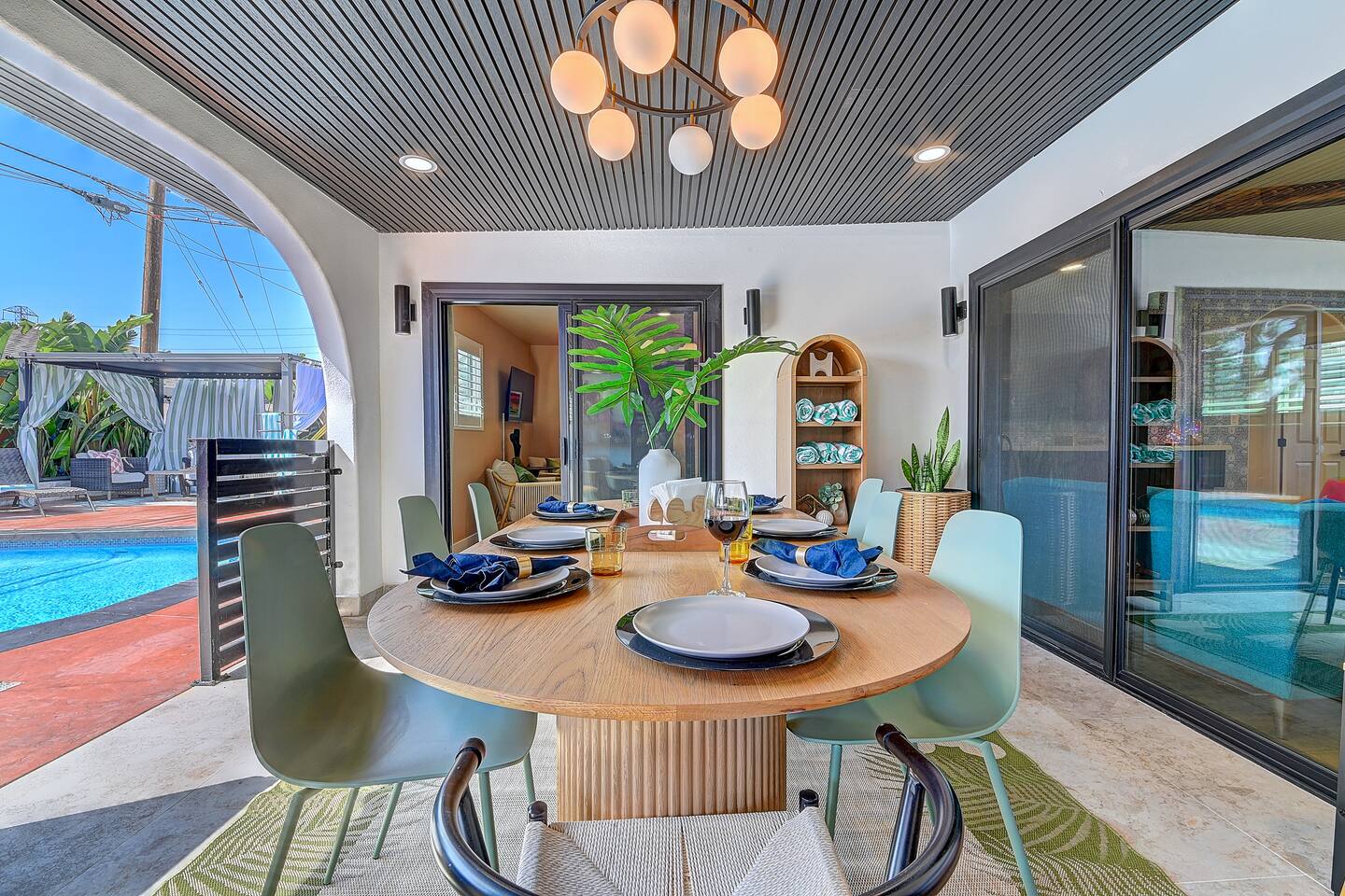 ✶ Covered California room with dining, seating, Smart TV and fireplace 🔥