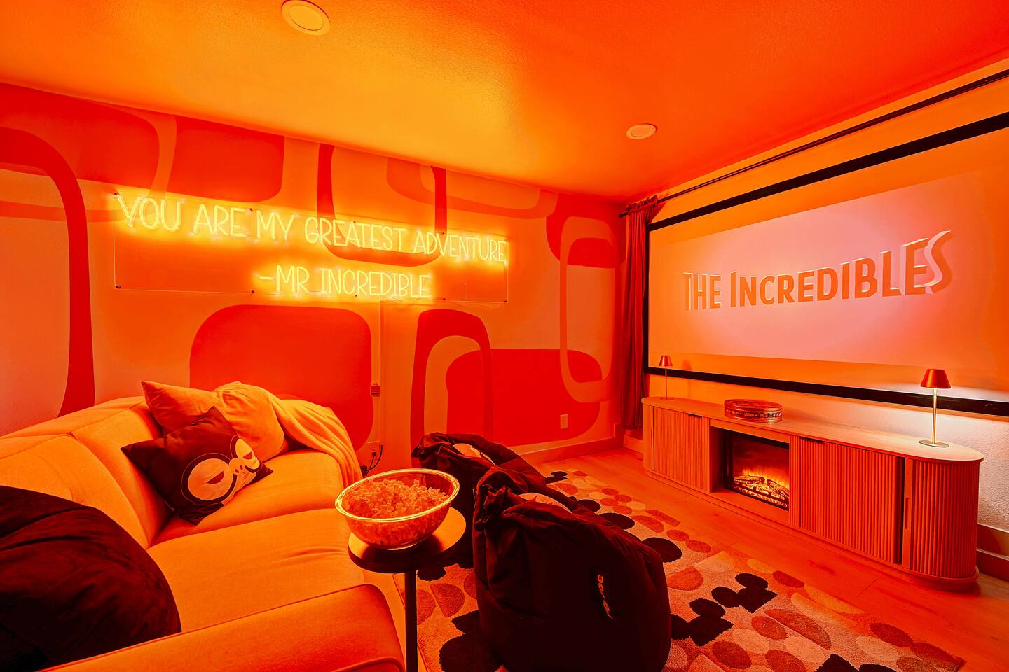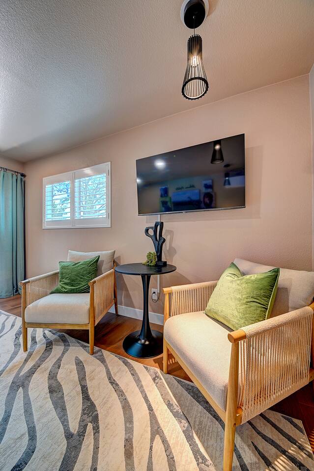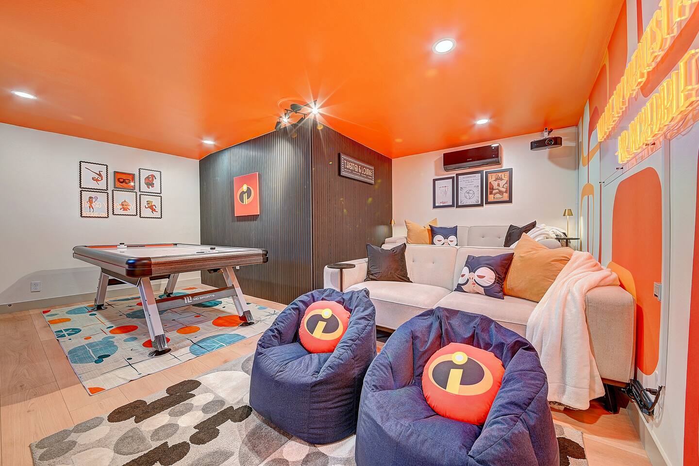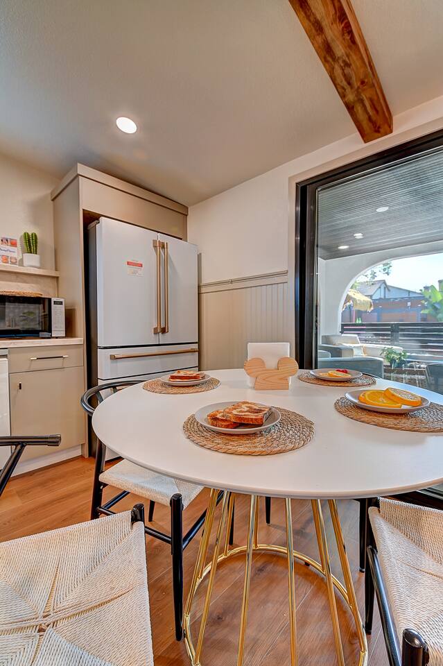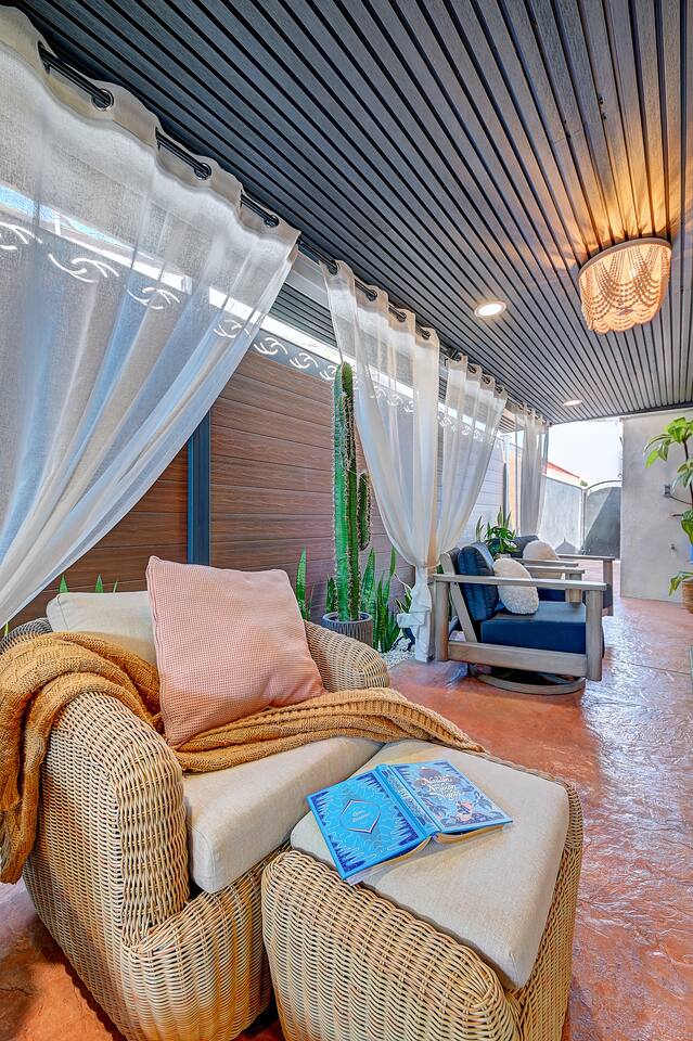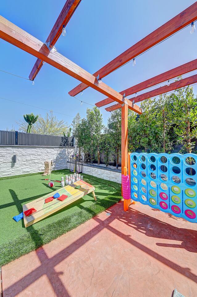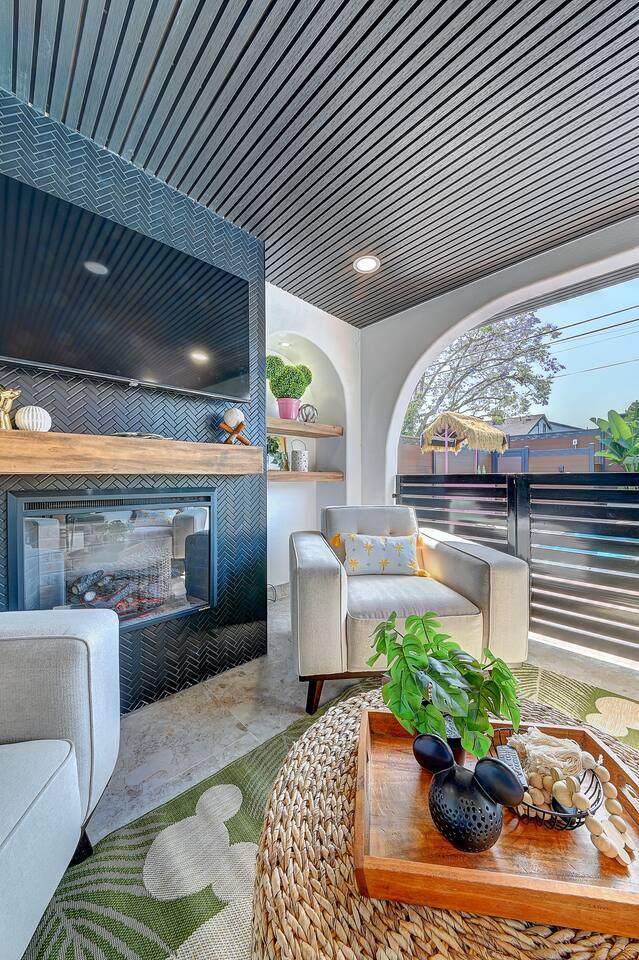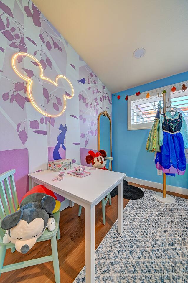 Perfect SoCal Location: 🏰 Disneyland Park 📍2 miles | 🚗 5–10 minutes ✈️ John Wayne Airport (SNA) 📍 14 miles | 🚗 15–20 minutes ✈️ Los Angeles International Airport 📍 35 miles | 🚗 40–60 minutes (traffic dependent) ⚾ Angel Stadium 📍 3 miles | 🚗 5–10 minutes 🏒 Honda Center 📍 4 miles | 🚗 8–12 minutes 🌊 Huntington Beach 📍 15 miles | 🚗 20–30 minutes ⸻ ✨ Your Home Away From Home ✶ 2000 sqft of living space ✶ Open-concept layout with exposed wood beams ✶ 5 Comfortable Bedrooms Designed for Rest ✶ Multiple en-suite bathrooms make mornings easy for larger groups ✶ Quality mattresses and hotel bedding ✶ Game Room and Theater 🎥 ✶ Air Hockey + Foosball ✶ Fully equipped chef’s kitchen with quartz countertops & premium appliances ✶ Dining space perfect for family-style meals ✶ Smart TVs throughout the home ✶ Three fireplaces for cozy evenings 🔥 ✶ Board games for unplugged fun ✶ Laundry room with Washer & dryer for longer stays ✶ Crib, toddler bed + high chair for your littlest Mouseketeers 👶 ✶ High-speed WiFi ✶ Free driveway parking space for 4 vehicles ✶ EV charger available ⸻ 🌴 Outdoor Living (Where You’ll Want to Stay All Day) ✶ Large heated pool 🏊 ✶ Outdoor mini golf (putt putt) ⛳ ✶ Yard Games: corn hole, bowling, Connect 4, Jenga ✶ Fire pit ✶ BBQ Grill ✶ Two Pergolas and Multiple lounge areas for relaxing ✶ Outdoor dining space for al fresco meals ✶ Covered California room with dining, seating, Smart TV and fireplace 🔥 ✶ Side yard with foosball + quiet seating area (think - mom's private time) ✶ Café string lights for magical evenings ✨ From pool days to fireside evenings, this backyard was made for core memory moments. ⸻ 🎬 Guest-Favorite Incredibles - Themed Game Room & Theater ✶ Theater-style viewing area ✶ Air hockey table 🏒 ✶ Foosball table ⚽ ✶ Lounge seating for movie nights ✶ Perfect teen hangout or rainy-day fun ⸻ 🍽️ Fully Equipped Kitchen ✶ Spacious open-concept layout ✶ Premium GE Cafe appliances and Pot-filler ✶ Fully stocked for cooking at home ✶ Waterfall island with bar seating for gathering ✶ Coffee bar with kettle, Keurig & drip options, coffee included! ✶ Kid-friendly dishes, cups, high chairs, and essentials Because traveling with kids should feel easy—not stressful. ⸻ 🧺 Dedicated laundry room (with a nod to Cinderella) ⸻ 🛏️ Sleeping Arrangements (5 Bedrooms) 🦁 Primary Suite (Lion King Inspired) ✶ King bed ✶ Private entrance from the California room ✶ En-suite updated tiled bathroom ✶ Walk-in closet ✶ Seating area (perfect for coffee or working) ✶ Space for a crib ✶ Smart TV ✶ Elegantly themed with personal safari photography ⸻ 🎪 Secondary Suite (Dumbo Inspired) ✶ Queen bed ✶ En-suite modern bathroom ✶ Smart TV ✶ Light, whimsical, and beautifully designed ⸻ ❄️ Kids Room (Frozen 2-Inspired) ✶ Full-over-twin bunk ✶ Twin trundle perfect for toddlers ✶ Princess dresses for dress-up ✶ Dollhouse + kids table for coloring or tea parties A dreamy space designed just for little ones ✨ ⸻ 🧙♀️ Wicked-Themed Room ✶ Two full-size beds ✶ Sliding door to relaxing side patio Note: While magical in its own way (and we know it’s not Disney 😉), this room has direct access to the pool area and is not recommended for small children. ⸻ 🏝️ Pirates of the Caribbean - Inspired Room ✶ Queen bed ✶ Smart TV ✶ sliding door with access to side yard + pool area A bold and immersive space for adventure lovers ⸻ 💛 Why Families Love Staying Here This isn’t just a place to sleep—it’s a home designed for real family travel. After a full day at Disneyland Park, come back to a space where both kids and adults can unwind, recharge, and create core memories together. ✔️ Thoughtfully stocked for kids ✔️ Spacious, design-forward interiors ✔️ Indoor + outdoor spaces to spread out ✔️ Close to the parks, but peaceful enough to truly relax 🌴 Book your Anaheim escape and experience the magic for yourself. ✨