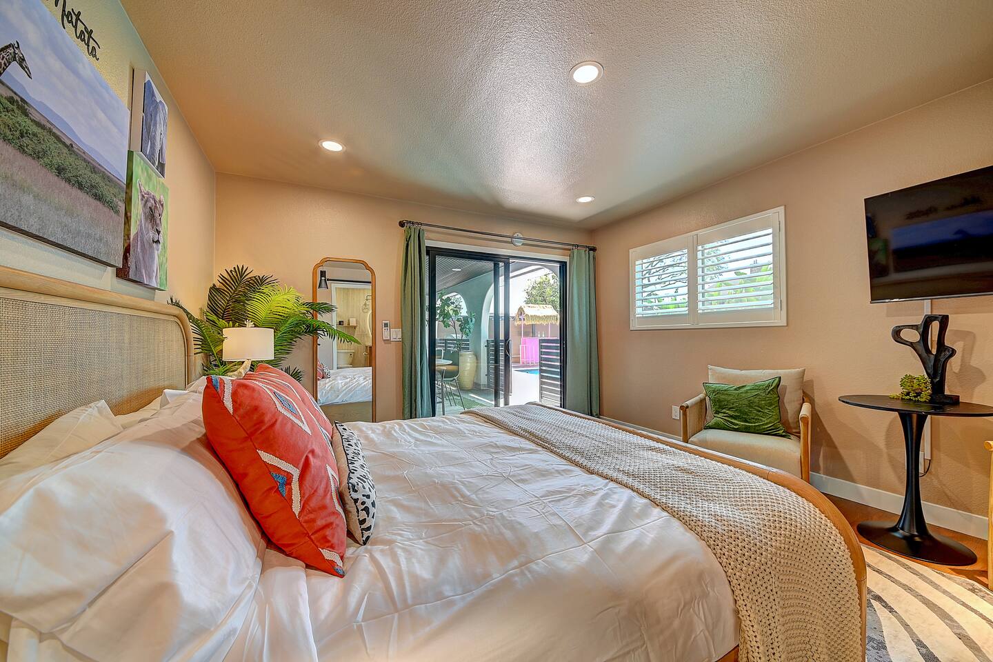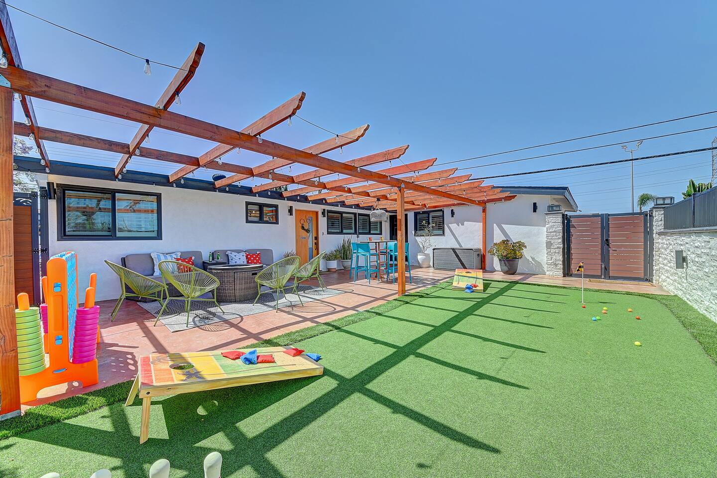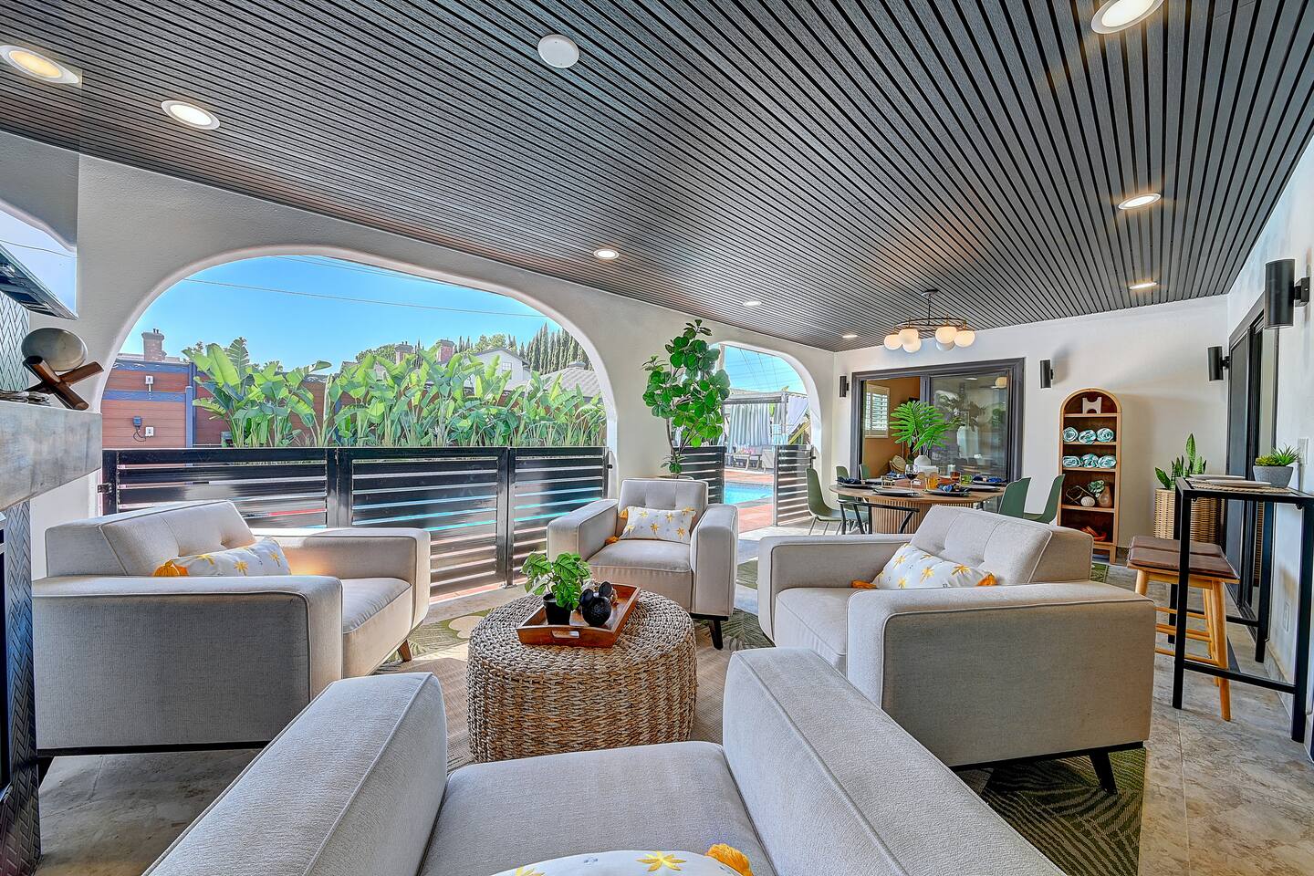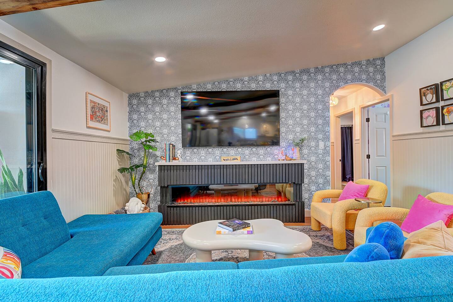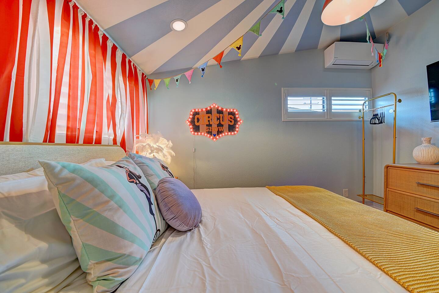 Perfect SoCal Location: 🏰 Disneyland Park 📍2 miles | 🚗 5–10 minutes ✈️ John Wayne Airport (SNA) 📍 14 miles | 🚗 15–20 minutes ✈️ Los Angeles International Airport 📍 35 miles | 🚗 40–60 minutes (traffic dependent) ⚾ Angel Stadium 📍 3 miles | 🚗 5–10 minutes 🏒 Honda Center 📍 4 miles | 🚗 8–12 minutes 🌊 Huntington Beach 📍 15 miles | 🚗 20–30 minutes ⸻ ✨ Your Home Away From Home ✶ 2000 sqft of living space ✶ Open-concept layout with exposed wood beams ✶ 5 Comfortable Bedrooms Designed for Rest ✶ Multiple en-suite bathrooms make mornings easy for larger groups ✶ Quality mattresses and hotel bedding ✶ Game Room and Theater 🎥 ✶ Air Hockey + Foosball ✶ Fully equipped chef’s kitchen with quartz countertops & premium appliances ✶ Dining space perfect for family-style meals ✶ Smart TVs throughout the home ✶ Three fireplaces for cozy evenings 🔥 ✶ Board games for unplugged fun ✶ Laundry room with Washer & dryer for longer stays ✶ Crib, toddler bed + high chair for your littlest Mouseketeers 👶 ✶ High-speed WiFi ✶ Free driveway parking space for 4 vehicles ✶ EV charger available ⸻ 🌴 Outdoor Living (Where You’ll Want to Stay All Day) ✶ Large heated pool 🏊 ✶ Outdoor mini golf (putt putt) ⛳ ✶ Yard Games: corn hole, bowling, Connect 4, Jenga ✶ Fire pit ✶ BBQ Grill ✶ Two Pergolas and Multiple lounge areas for relaxing ✶ Outdoor dining space for al fresco meals ✶ Covered California room with dining, seating, Smart TV and fireplace 🔥 ✶ Side yard with foosball + quiet seating area (think - mom's private time) ✶ Café string lights for magical evenings ✨ From pool days to fireside evenings, this backyard was made for core memory moments. ⸻ 🎬 Guest-Favorite Incredibles - Themed Game Room & Theater ✶ Theater-style viewing area ✶ Air hockey table 🏒 ✶ Foosball table ⚽ ✶ Lounge seating for movie nights ✶ Perfect teen hangout or rainy-day fun ⸻ 🍽️ Fully Equipped Kitchen ✶ Spacious open-concept layout ✶ Premium GE Cafe appliances and Pot-filler ✶ Fully stocked for cooking at home ✶ Waterfall island with bar seating for gathering ✶ Coffee bar with kettle, Keurig & drip options, coffee included! ✶ Kid-friendly dishes, cups, high chairs, and essentials Because traveling with kids should feel easy—not stressful. ⸻ 🧺 Dedicated laundry room (with a nod to Cinderella) ⸻ 🛏️ Sleeping Arrangements (5 Bedrooms) 🦁 Primary Suite (Lion King Inspired) ✶ King bed ✶ Private entrance from the California room ✶ En-suite updated tiled bathroom ✶ Walk-in closet ✶ Seating area (perfect for coffee or working) ✶ Space for a crib ✶ Smart TV ✶ Elegantly themed with personal safari photography ⸻ 🎪 Secondary Suite (Dumbo Inspired) ✶ Queen bed ✶ En-suite modern bathroom ✶ Smart TV ✶ Light, whimsical, and beautifully designed ⸻ ❄️ Kids Room (Frozen 2-Inspired) ✶ Full-over-twin bunk ✶ Twin trundle perfect for toddlers ✶ Princess dresses for dress-up ✶ Dollhouse + kids table for coloring or tea parties A dreamy space designed just for little ones ✨ ⸻ 🧙♀️ Wicked-Themed Room ✶ Two full-size beds ✶ Sliding door to relaxing side patio Note: While magical in its own way (and we know it’s not Disney 😉), this room has direct access to the pool area and is not recommended for small children. ⸻ 🏝️ Pirates of the Caribbean - Inspired Room ✶ Queen bed ✶ Smart TV ✶ sliding door with access to side yard + pool area A bold and immersive space for adventure lovers ⸻ 💛 Why Families Love Staying Here This isn’t just a place to sleep—it’s a home designed for real family travel. After a full day at Disneyland Park, come back to a space where both kids and adults can unwind, recharge, and create core memories together. ✔️ Thoughtfully stocked for kids ✔️ Spacious, design-forward interiors ✔️ Indoor + outdoor spaces to spread out ✔️ Close to the parks, but peaceful enough to truly relax 🌴 Book your Anaheim escape and experience the magic for yourself. ✨